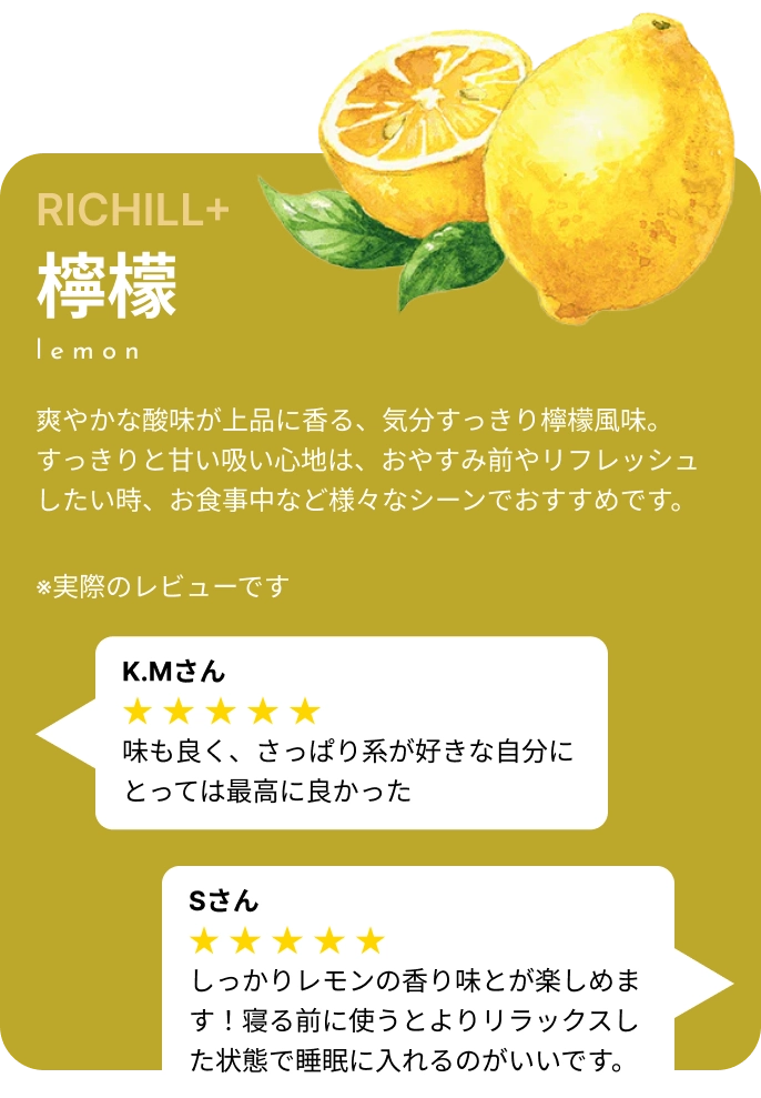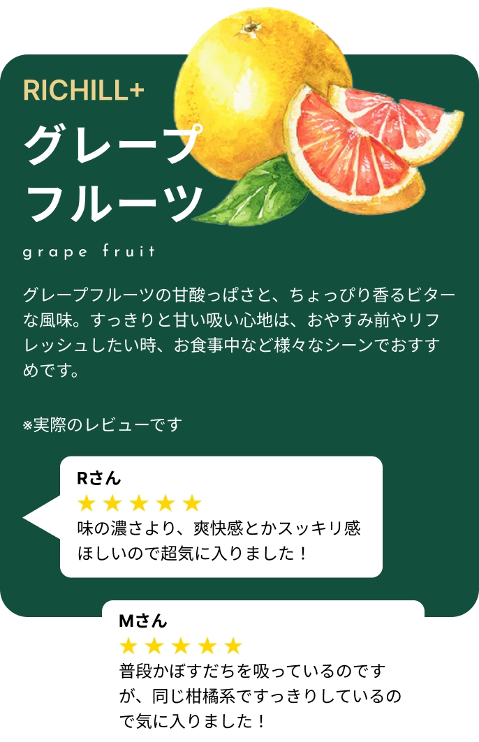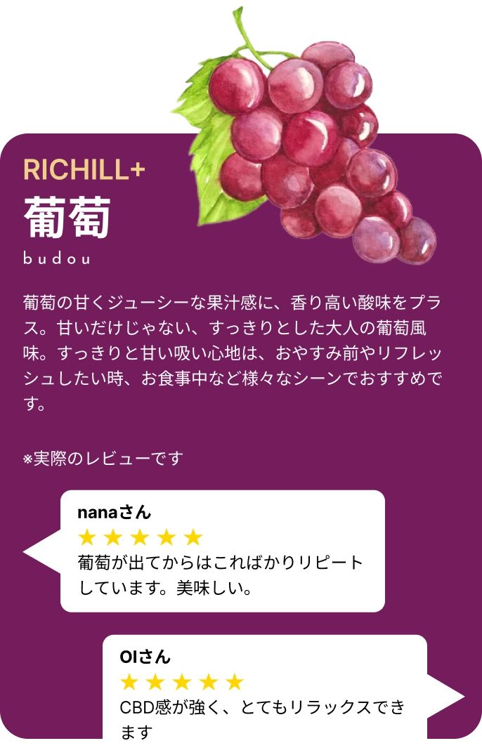 アンケートなどでチル主の意見を参考にしながらフレーバー開発に反映してるのでRICHILLならあなたの好きな味が実現できるかも!?
